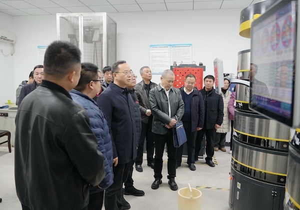 谈文胜一行近距离查看200吨全自动智能抗压强度系统。