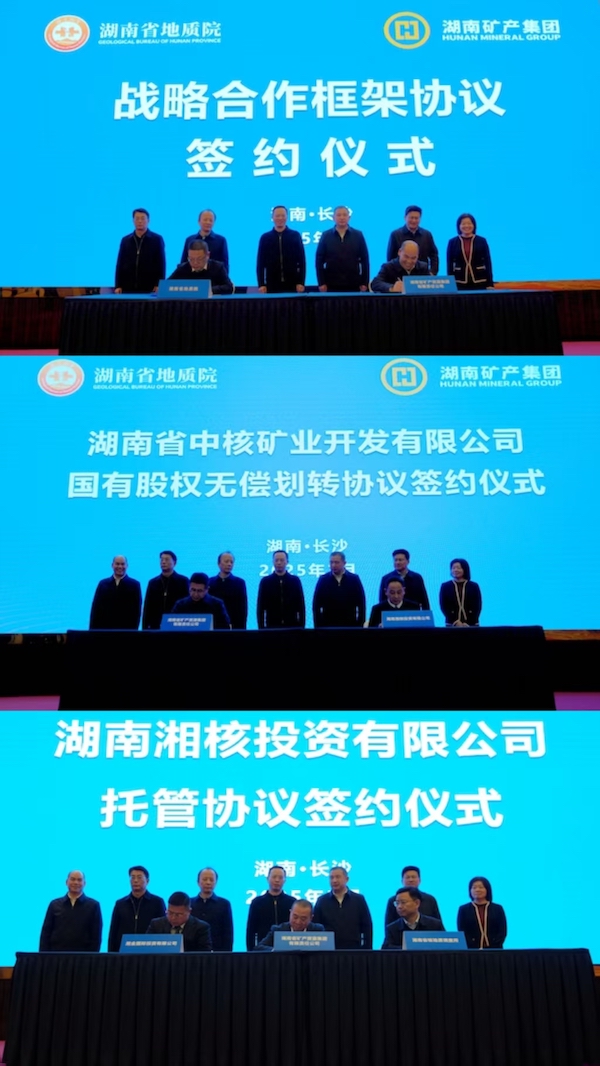 在与会领导的见证下,双方依次签订了《省地质院与湖南矿产集团战略合作框架协议》《湖南省中核矿业开发有限公司国有股权无偿划转协议》《湖南湘核投资有限公司托管协议》。此次签约,标志着双方在矿产勘查、开采及开发利用领域将开启全方位、深层次的战略合作新篇章。这一合作不仅对于深化省地勘单位改革、实现事企分开与主辅剥离的改革任务具有重要意义,更将极大地推动矿产资源探、产、供、储、销体系的全面优化与升级。通过合作,双方将携手为保障国家能源资源安全及重要产业链供应链的稳定提供坚实支撑,为湖南矿业产业的高质量发展注入新动力。