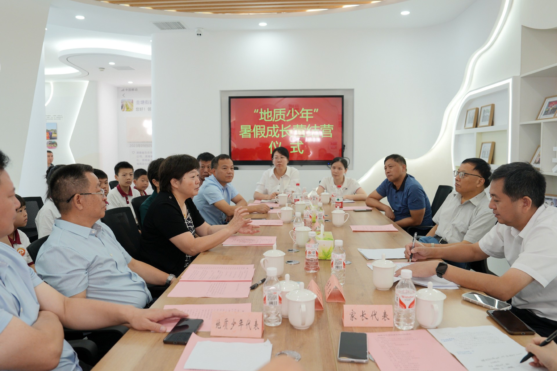 座谈交流环节,吴兵良介绍了暑假成长营的开展情况,对少年们的成长与收获给予肯定。地质少年代表易瑾浩发言,分享了自己的所见所闻、所学所感,言语中流露出对地质事业的敬畏与向往。两位家长代表苏媛、曹晖分别发言,表达了对孩子成长的欣慰以及对多方组织的感谢之情。