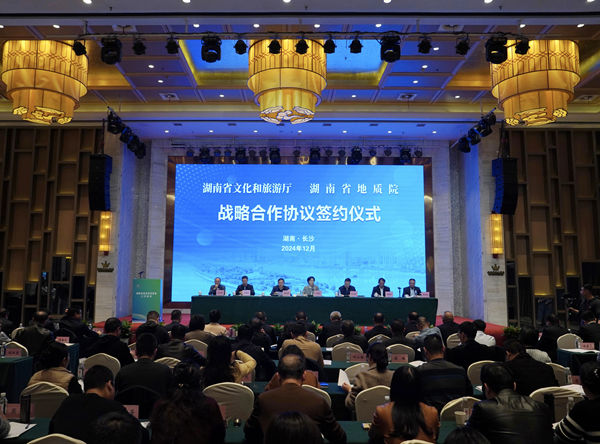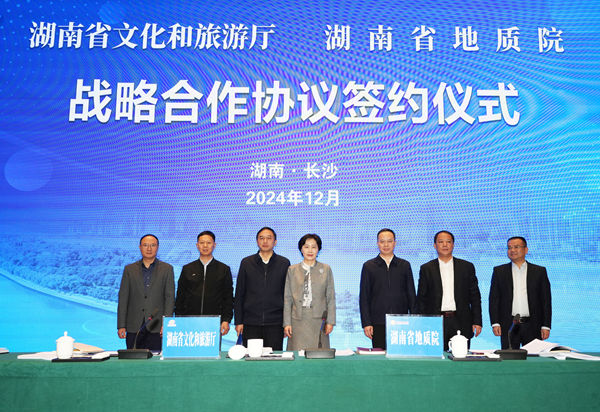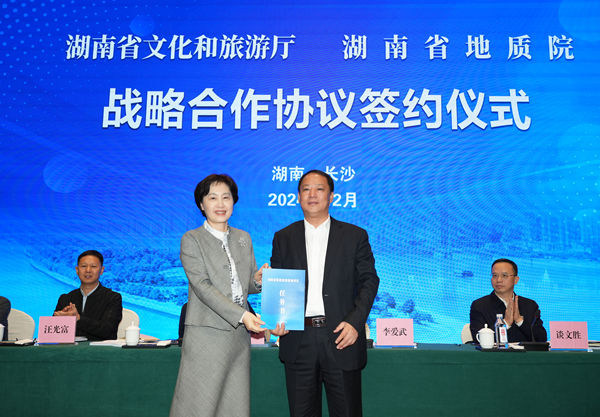 谈文胜指出,地质和文旅有着天然联系,地质景观和地质遗迹是自然景观的重要组成部分,地质要素是文旅产业发展的“本底”。省地质院立足职能定位和特色优势,在发掘优质旅游资源、打造世界和国家地质公园、建设地质文化村(镇)、旅游景区地灾预警排查等方面做了一大批基础性服务性工作,探索出了一条应用“地质+”模式助力“文旅富民”的道路,以实际行动彰显了地质之为、地质所能。双方正式签订战略合作协议,文化旅游发展与地质技术支撑“双向奔赴”,既是双方面向未来的“再出发”,更是志同道合的“再联手”。就深化双方的战略合作,他提出三点期盼:一要同向发力塑品牌。省文旅厅与省地质院将双方优势有机结合,围绕合作内容,采取务实有效措施,转化资源为文旅魅力,打造知名湖南文旅品牌。二要深度融合拓空间。要以资源合理开发利用为核心,深化双方在多领域的合作,创新合作模式与举措,推动合作迈上新台阶。三要科技创新建高地。融合地质与地理信息数据,利用“地质云”和“实景三维”,赋能湖南文旅,延长产业链,提高附加值,开发湖湘特色文旅新模式。